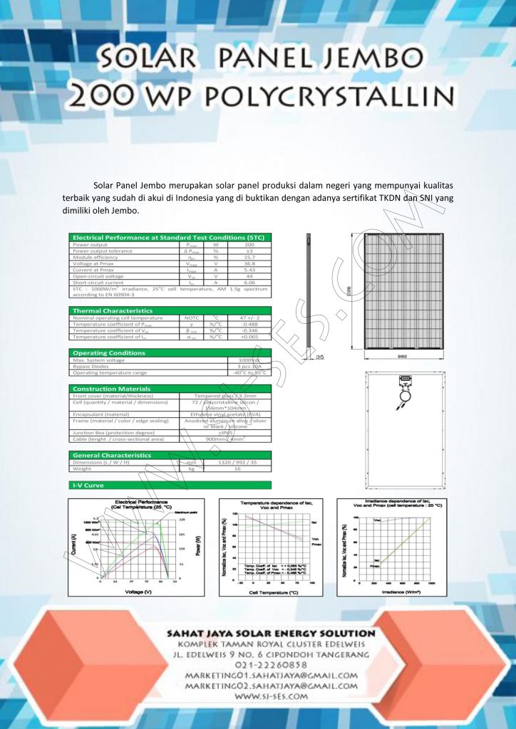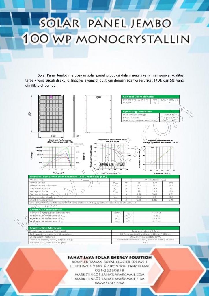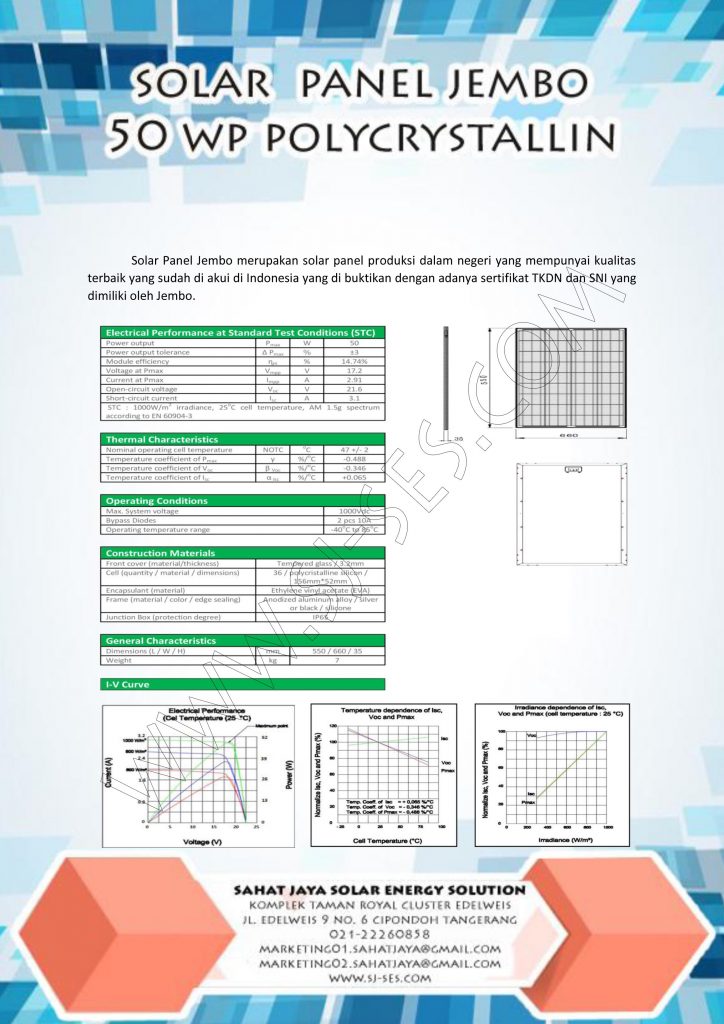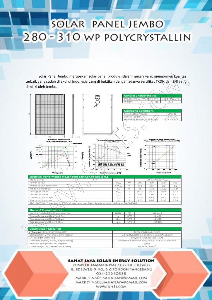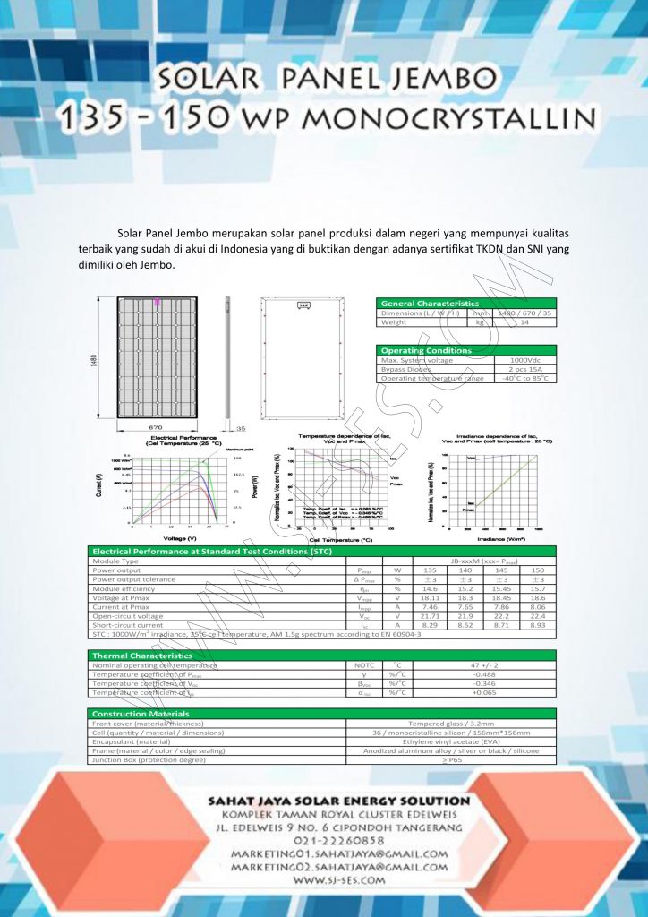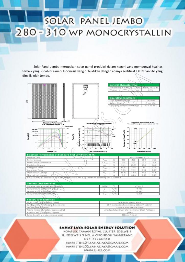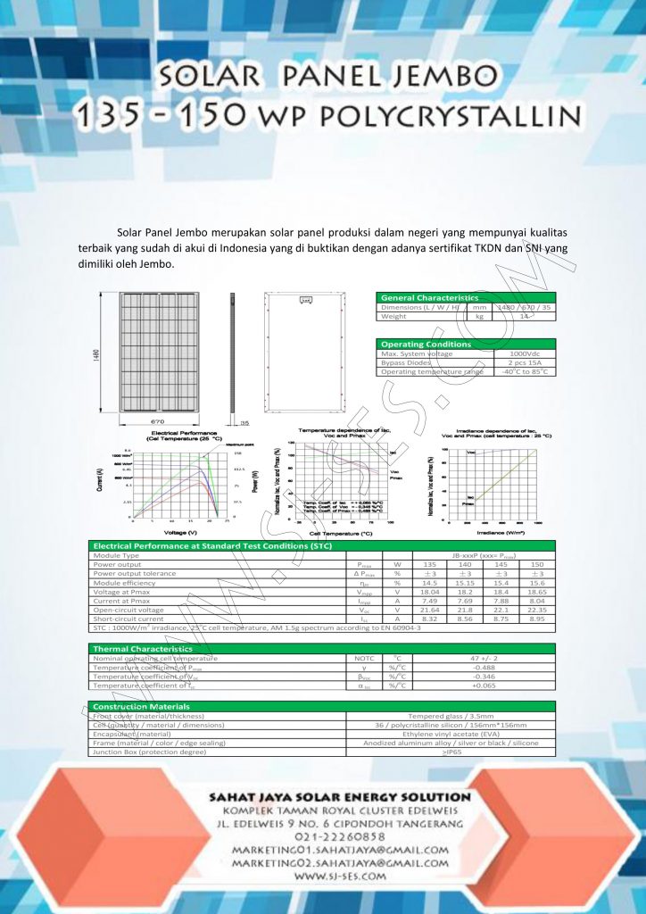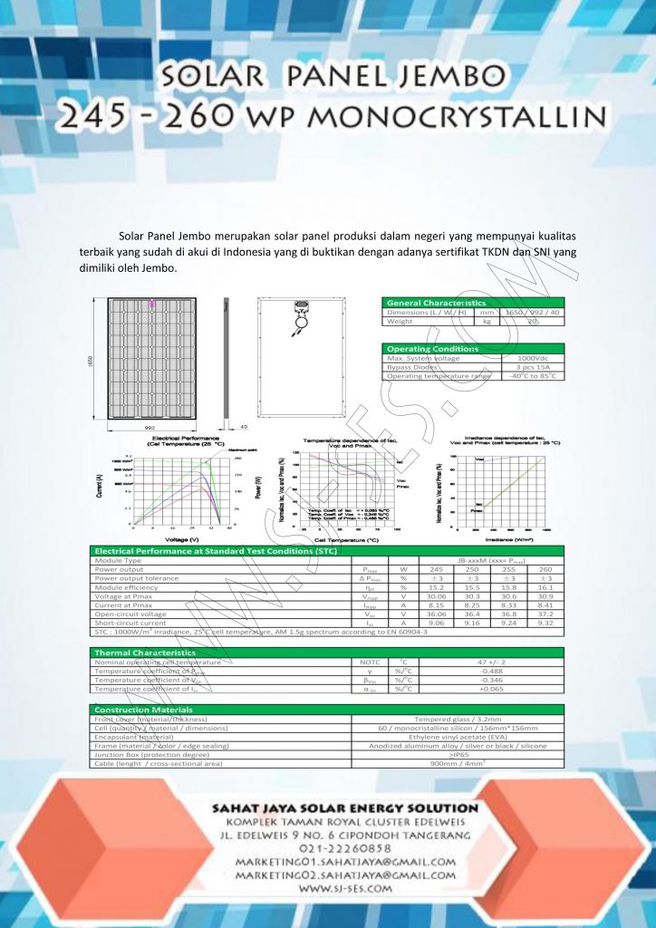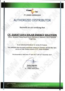 Sahat Jaya Solar Energy Solution ( SJ-SES ) merupakan distributor solar panel Jembo yang mempunyai sertifikat TKDN dan SNI, selain jembo , SJ-SES merupakan Distributor , Agen, Supplier untuk produk-produk yang mempunyai standart SNI, seperti Jembo, Sankelux, Sky, Gei dll.
